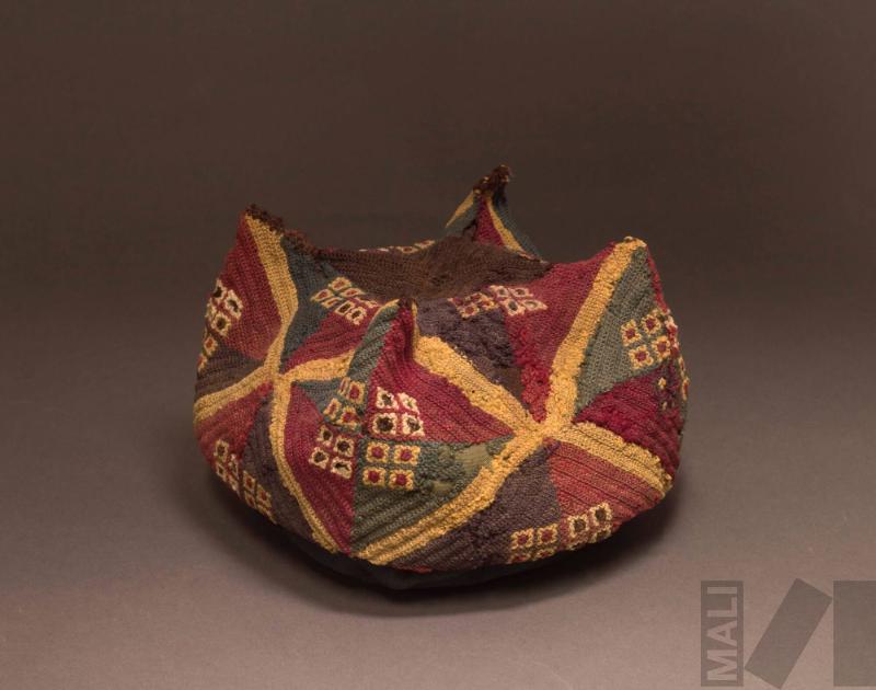 DescripciónGorro de cuatro puntas con diseños geométricos en composición romboidal