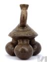 DescripciónBotella escultórica de asa estribo y base trípode de formas globulares. Presenta un cuerpo cónico con diseños geométricos incisos.ESTATUS