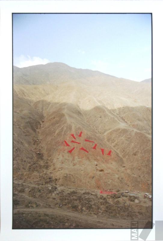 DescripciónA color. Imagen panorámica. Impresiones de diez siluetas en rojo de cantuta sobre superficie de loma, cerca de cruz blanca y fosa. En la zona inferior del encuadre están las herramientas y materiales utilizados por el artista para la acción