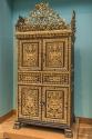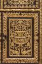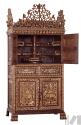 DescripciónArmario de tres niveles y dos cuerpos. Las patas tienen diseño de hojas. Los niveles, inferior y superior, presentan puerta a dos hojas decoradas con paneles de jarrones con follaje y cabezas de ave enmarcadas en orla de hojas en dorado sobre fondo de madera. El nivel central, con dos cajones con diseños vegetales. Puertas con cerradura de hierro y cajones con tiradores de argolla. Los paneles laterales con motivos de roleos. El interior presenta divisiones con balaustrada y adornado con motivos florales. El mueble remata con tres peinetas (una frontal y dos laterales) caladas y doradas con diseño de follaje.ESTATUS