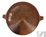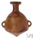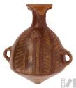DescripciónAríbalo miniatura con diseños geométricos de líneas con puntos, aspas y aplicación escultórica de rostro de felinoESTATUS