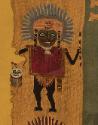 Manto con diseños de guerreros míticos sosteniendo cabezas trofeo
