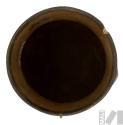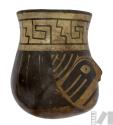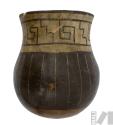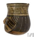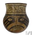 DescripciónVaso con representación de cabeza trofeo con tocado, bigote y pintura facialESTATUS