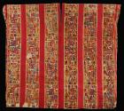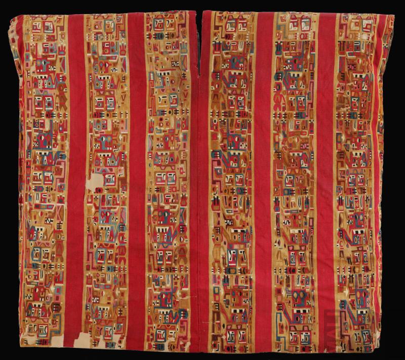 DescripciónUnku de dos paños con representación de figuras estilizadas que representan personajes humanos con rasgos de felinos y camélidos portando báculos y sosteniendo prisioneros, dispuestas en bandas transversales