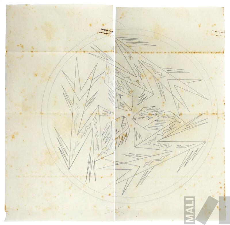 Parte izquierda de obra. En formato rectangular vertical. Composición en base a una figura mixtilínea inscrita en un círculo al lado derecho. La figura esta cortada.