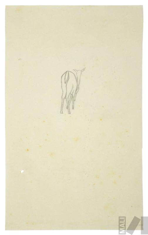 Obra de formato rectangular horizontal. Composición en base a ciervo de cuerpo entero cuya parte trasera da al espectador. Tiene la cabeza levantada.