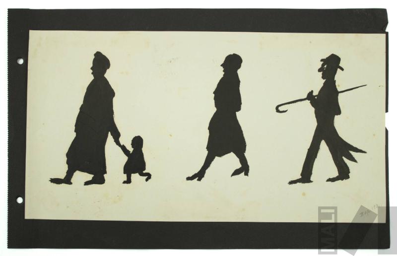 DescripciónObra de formato rectangular horizontal. Composición en base a tres figuras antropmorfas. En la parte derecha figura masculina de perfil a la izquierda con sombrero, báston y traje. En la parte central figura femenina de perfil a la izquierda y a su lado izquierdo figura femenina con una figura infantil de la mano.