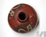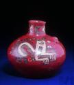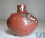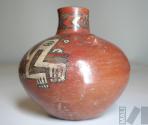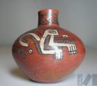 DescripciónCántaro con representación de un animal mítico de cuerpo encorvado y geometrizado, así como diseño de chevrones en el cuelloESTATUS