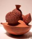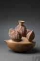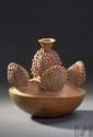 DescripciónPaccha de gollete cónico invertido y pico lateral con representación de cinco conchas de Spondylus sobre cuerpo semiglobular. / Paccha de cuerpo semiesférico con vertedero tubular ubicado en el borde, aplicaciones zoomorfas y base semiplana. En la mitad superior del cuerpo se ubican cinco Spondylus escultóricos pintados de rojo: uno de ellos con gollete de paredes evertidas.ESTATUS