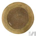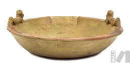DescripciónPlato con representación de cangrejo y concha de Spondylus en el fondo, en cuyos bordes se representan dos personajes echados. / Plato de labio plano con vertedero, cuerpo semiesférico con cuatro aplicaciones escultóricas y base semiplana. Labio resaltado con pintura anaranjada. Sobre el labio se sitúan dos personajes antropomorfos en posición decúbito ventral. En el fondo se observa un cangrejo y detrás de él, un Spondylus. Bícromo: crema y anaranjado oscuro.ESTATUS