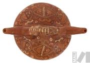 DescripciónBotella de doble pico y asa puente decorada con motivos estilizados de criaturas bicéfala y una representación escultórica de una iguana sobre el asaESTATUS