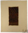 DescripciónObra en formato rectangular vertical. Composición en base a representación de textil prehispánico decorado con figuras geométricas lineales, zigzagueantes y cuadradas, sobre un fondo marrón.ESTATUS