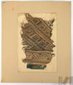 DescripciónObra en formato rectangular vertical. Composición en base a representación de textil ichma con diseños lineales y escalonados en laparte superior y en la parte inferior diseños circulares.ESTATUS