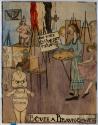 DescripciónComposición en formato rectangular vertical. Escena de un salón de pintura. En el primer plano vemos una cartela en la parte inferior derecha, y al otro extremo inferior una figura antropomorfa que, también, se utiliza como cartela. En segundo plano una mujer delante de un caballete dibuja unas letras, al costado derecho hay una modelo y en el costado izquierdo un hombre sentado dibuja. En el último plano y al lado derecho unas niñas se asoman detrás de sus lienzos; y, al otro lado vemos una modelo desnuda posar. En el fondo hay un cuadro, una bandera y una cruz colgados en la pared.ESTATUS