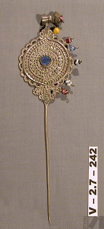 DescripciónTupu. La parte superior presenta un recipiente miniaturizado con pequeñas joyas. La sección central, que es de forma ojival y tiene al centro una gema azul, posee a la derecha seis piedras preciosas. La parte inferior está terminada en un alfiler.