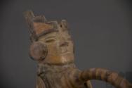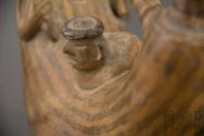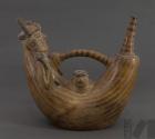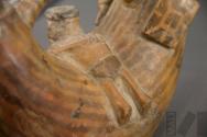 DescripciónBotella con gollete y asa lateral que representa a un guerrero con tocado escalonado y armado con porra y escudo, junto a un prisionero con manos atadas.ESTATUS