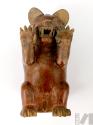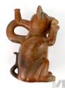 DescripciónBotella escultorica con representación de un felino macho (puma?) sentado sobre sus patas traseras y en actitud rampante. Estilo Moche I-II/ Mochica Temprano.ESTATUS