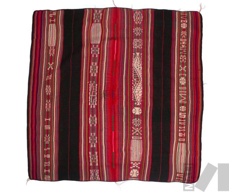 DescripciónTejido llano en fibra de alpaca con cara de urdimbre tornasol (poco pronunciado); saltas con técnica de tela doble; pampa negra; rayitas rojo, morado (claro y oscuro, vino, verde, naranja, blanco; saltas blancas sobre rayas; verde, rojo y vino; ribete vino y rojo; costura central rojo, verde, rosado, morado; trama rojo/negro; saltas grandes : nayra, raucana y letras; terminación en rayas; ribete tejido con motivos en forma de rayas; costura central de varios colores