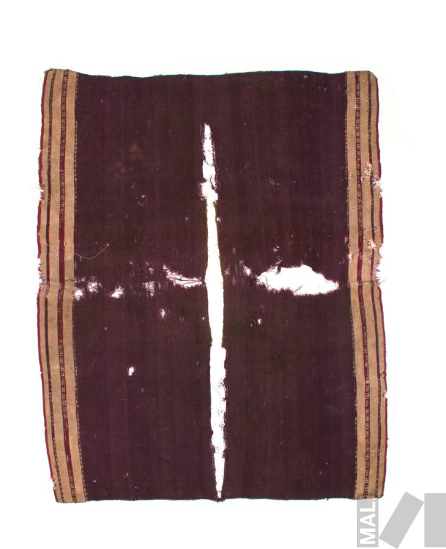 DescripciónTejido llano en fibra de alpaca con cara de urdimbre y saltas con urdimbre suplementaria flotante; pampa morada; rayas laterales blancas con rayitas; rosado oscuro y morado; saltas rosado, morado con blanco; ribete verde; trama jaspeada rosado oscuro/azul; ribete tejido alrededor del textil y del cuello; ccahua rara por tener saltas (puntita y casas con cerros)