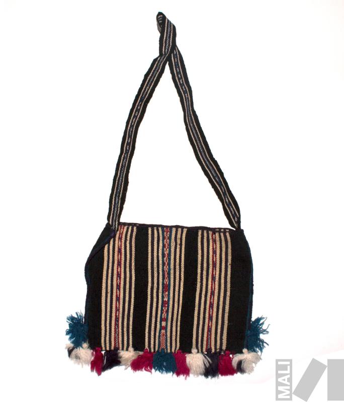 DescripciónTejido llano en fibra de alpaca con cara de urdimbrey saltas con urdimbre complementaria simple; pampa negra; rayitas blanco, morado/negro (n/m); saltas azul, rosado oscuro con blanco; borde azul; ribete m/n; cinta : negra, rayitas blancas, m/n y saltas azul con blanco; flecos rosado morado, blanco, azul; saltas de 2 (quicha palomita) y 6 pares; ribete tejido; y flecos; trama en Z