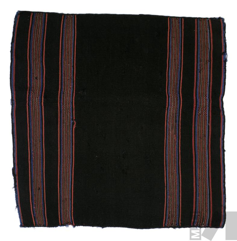 DescripciónTejido llano en fibra de alpaca con cara de urdimbre y qopi; pampa negra, borde con rayitas azul y salmon, qopi - salmon oscuro y claro con negro, rayitas salmon, negro