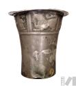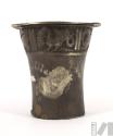 DescripciónVaso de cuerpo troncocónico invertido de borde plano evertido recto y base plana. En la zona superiorpresenta una sección de cuatro cuadrantes de fondo puntillado, con relieve de dos dragones, una quimera y un ser antropomorfo tocando un instrumento de viento, portando un sombrero con penacho de plumas.ESTATUS