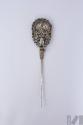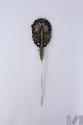 DescripciónPrendedor en forma de agua, remate de contorno mixtilíeno resuelto en calado, volutas y rocalla con motivo de ave bicéfala. En la base: diseño foliar con argolla. Vástago tubular de terminación aguda. Presenta inscripción P.S.ESTATUS