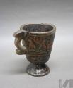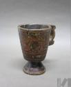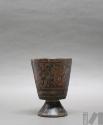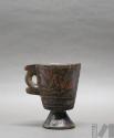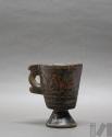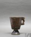 Taza de madera con asa lateral y base pedestal con representación de personajes y flores de k'antu