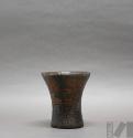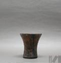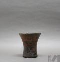 Taza de madera con asa lateral y base pedestal con representación de personajes y flores de k'antu