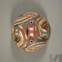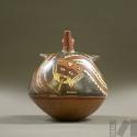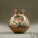 DescripciónBotella de labio recto. borde convergente, doble gollete cónico, asa puente cintada y cuerpo esferoide ligeramente carenado y base convexa. Posee la parte media superior del cuerpo decorado con la representación de un personaje con rasgos de felino y serpiente, además de diseños de serpientes y arañas sobre sus telarañas. Las cabezas de las serpientes se encuentran definidas como aplicaciones en la vasija. Estos diseños se encuentran dispuestos en todo el cuerpo sobre un fondo de color marrón oscuro. Las representaciones decorativas son de color: marrón rojizo, marrón oscuro, naranja, beige, negro y blanco.