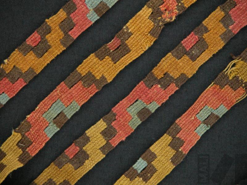 DescripciónCinta con diseños de semi cruz escalonada. Presenta flecos en un extremo