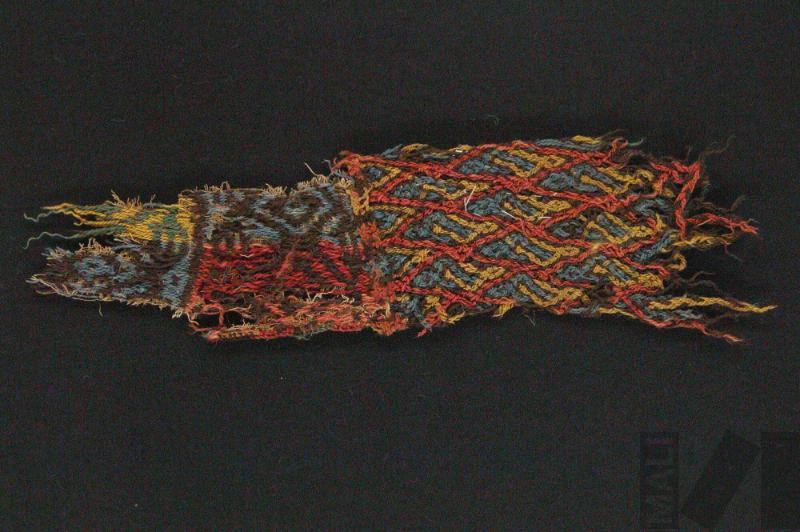 Sprang, tela llana y bordado en algodón y fibra de camélido
