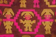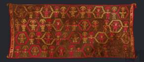 DescripciónManto ceremonial con diseños de personajes en posición frontal portando tocados de media luna y orejeras, algunos de los cuales se encuentran cargados en andasESTATUS